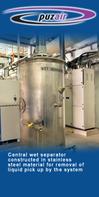 The Central Unit generates a vacuum which can be used to clean floors, machines, and the air; it can pick up and transport liquid and solid wastes; it can pick-up and transport in-process materials and move them from one building or plant to another; it can remove dangerous, volatile, corrosive and contaminating substances from the air and from manufacturing areas or anywhere they are generated-this is also called a Scavenging Vacuum System; it can pick-up spilled material and route it back to storage for re-use.